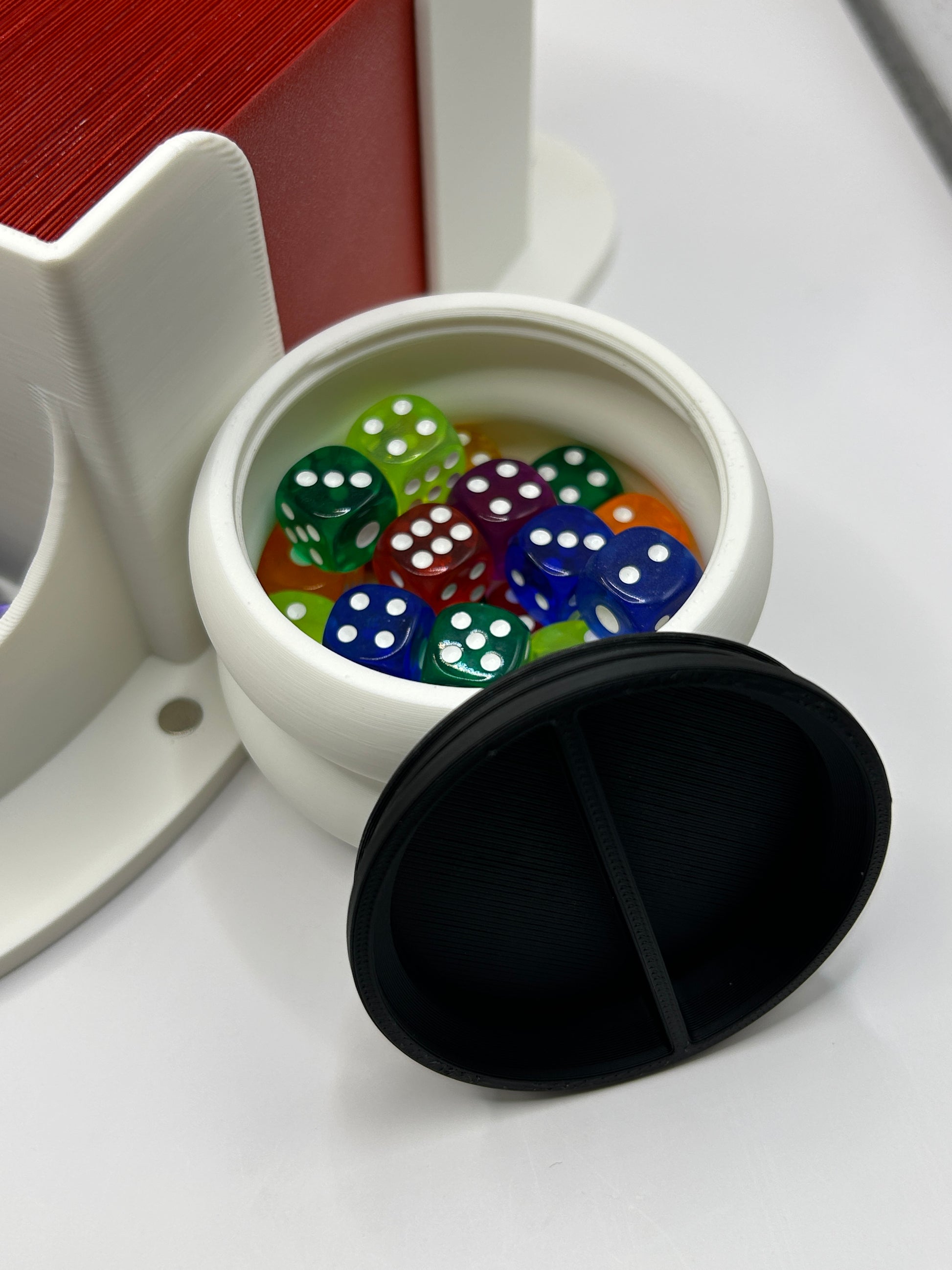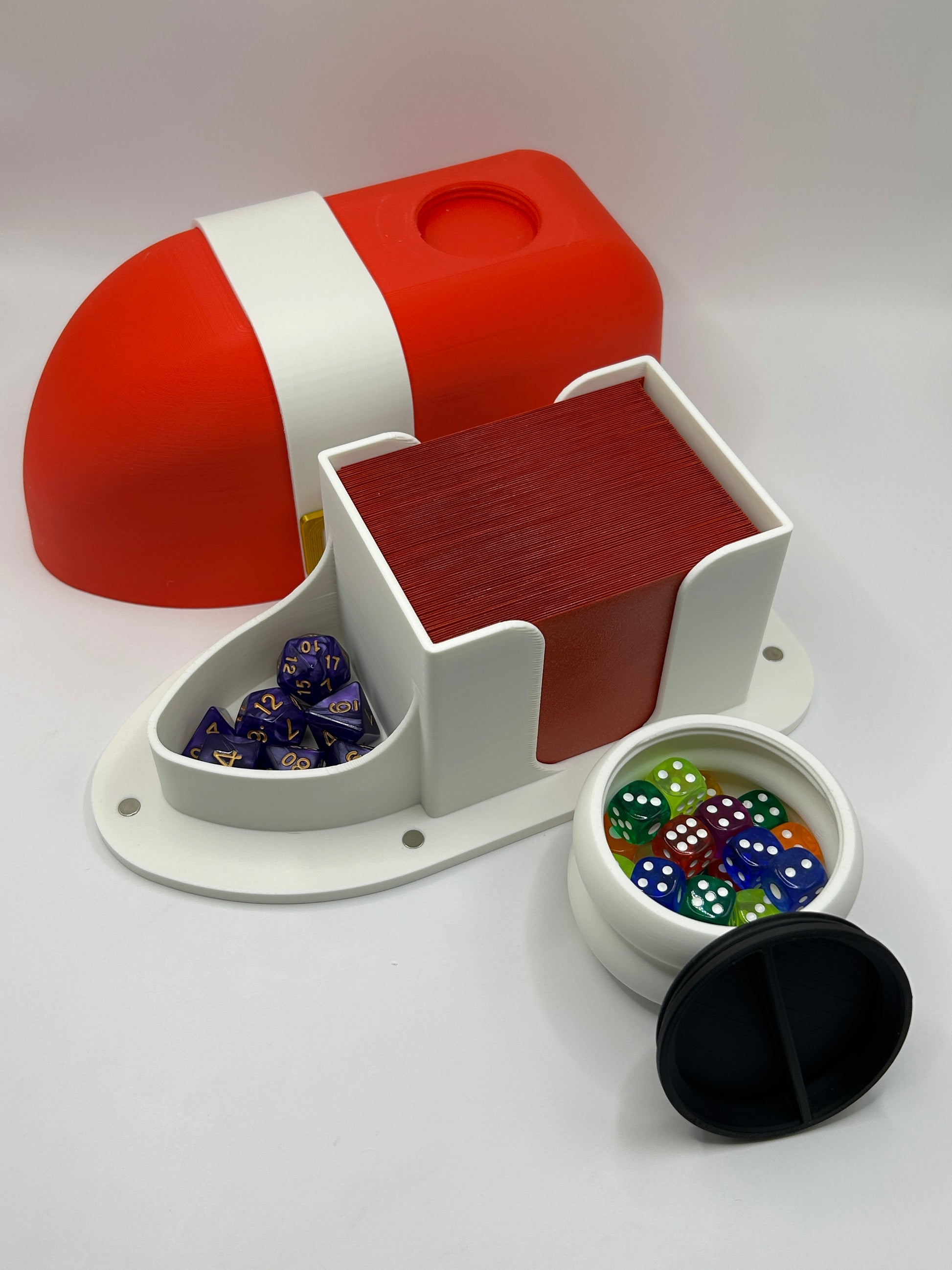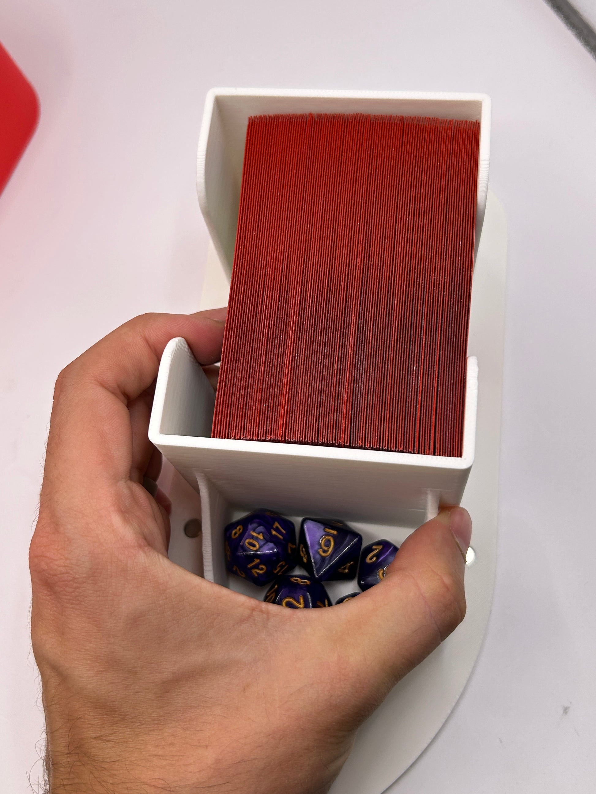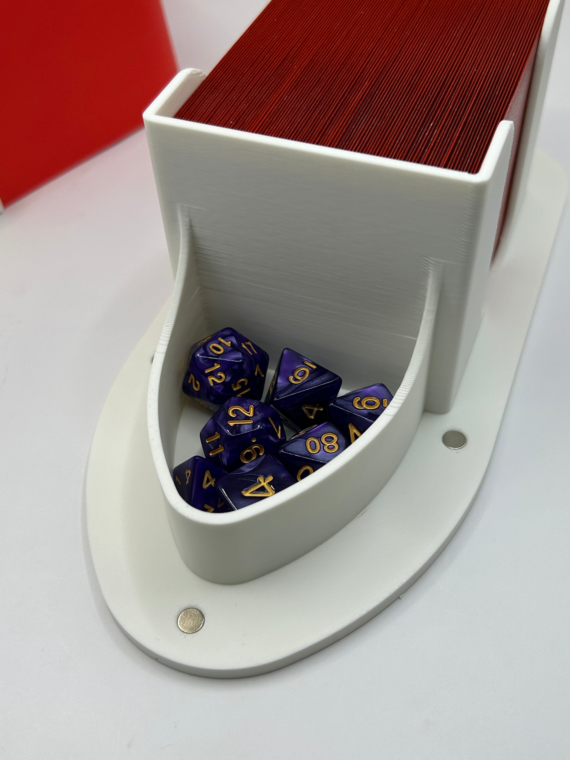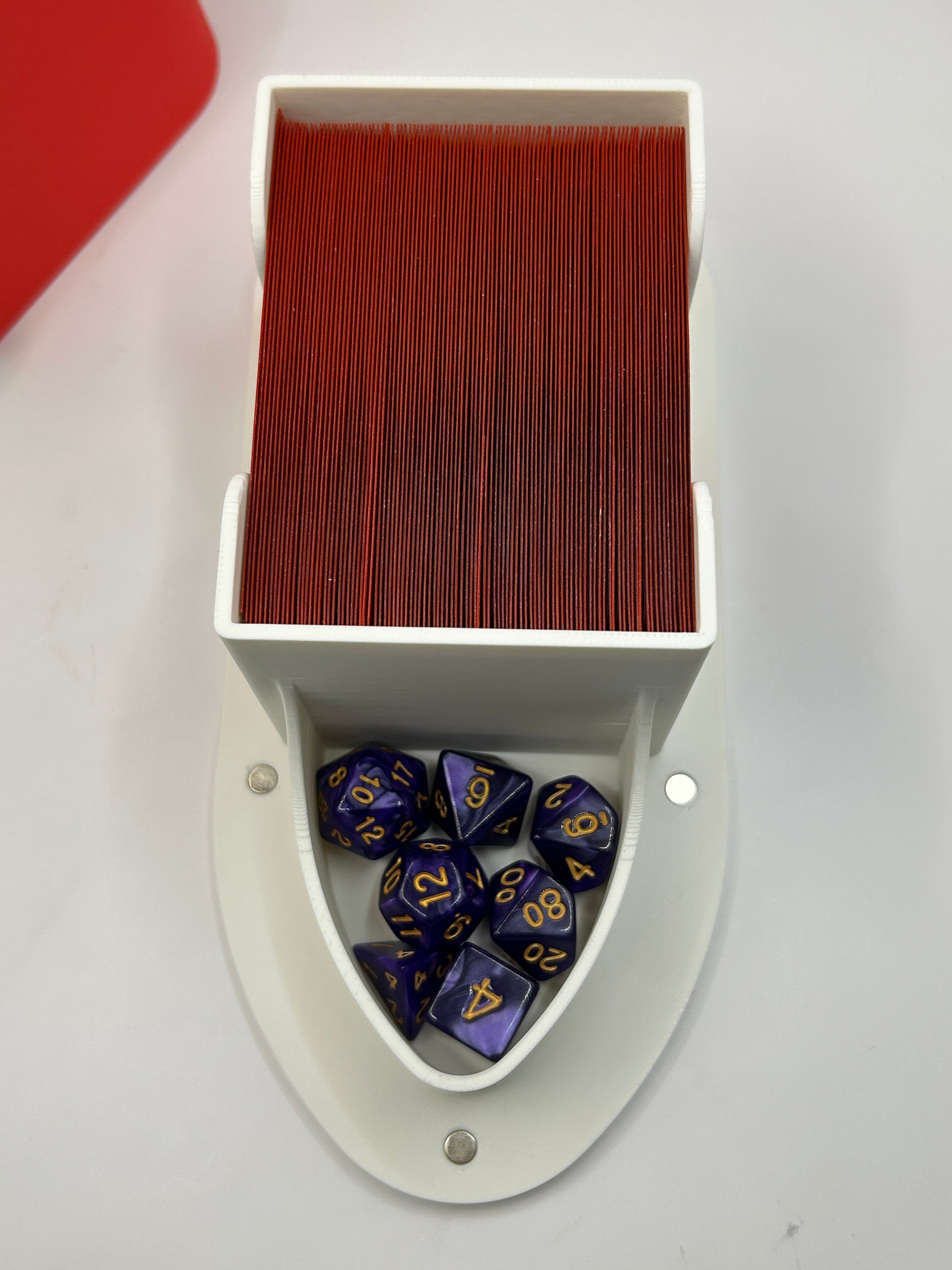 Bring your Sonic deck to life with a custom deck box that focuses on functionality and display! This deck box has one size designed to fit 100 sleeved cards with a bit of extra room. There is also a built in dice tray by the deck and a removable dice tray on top!