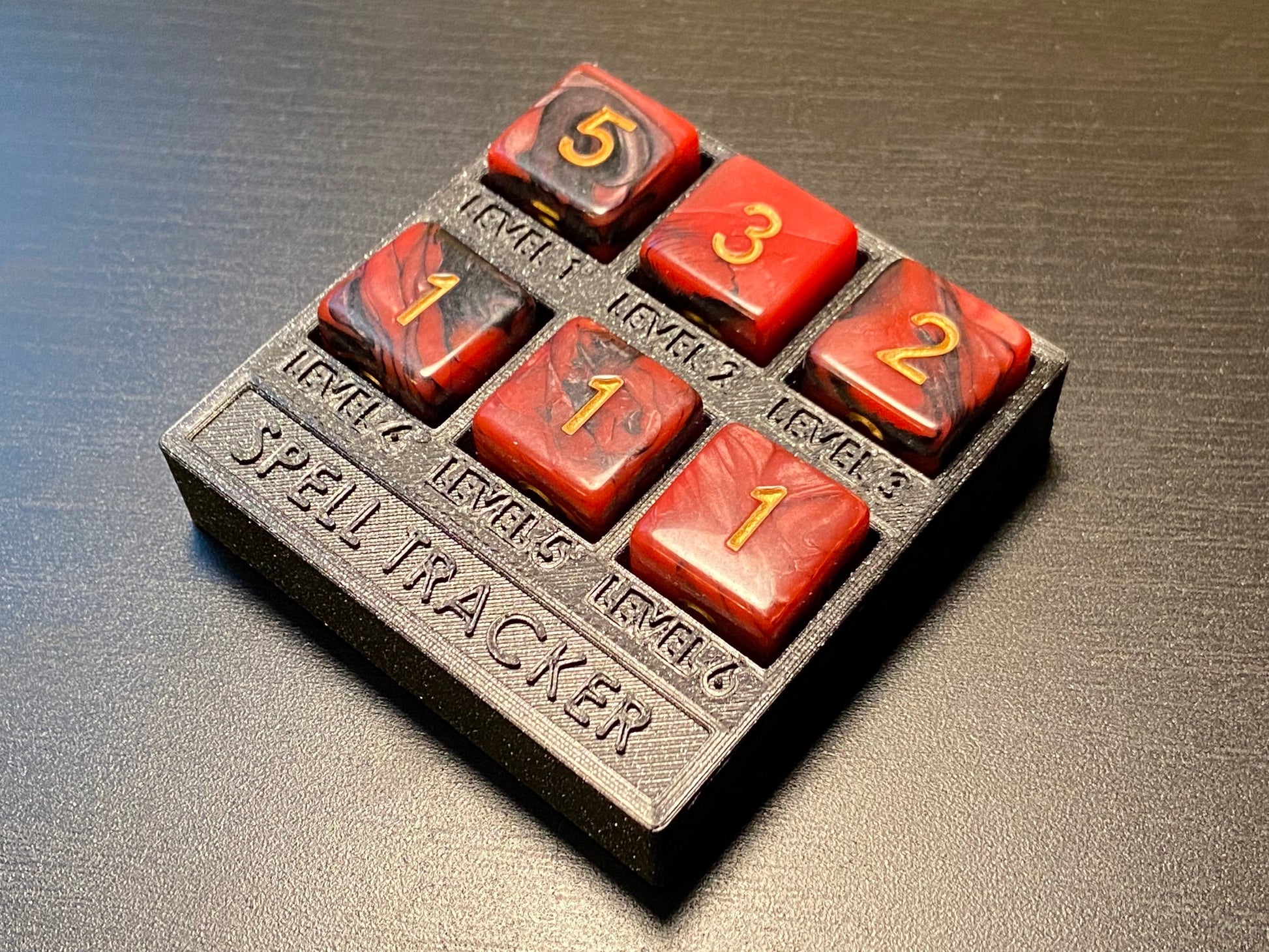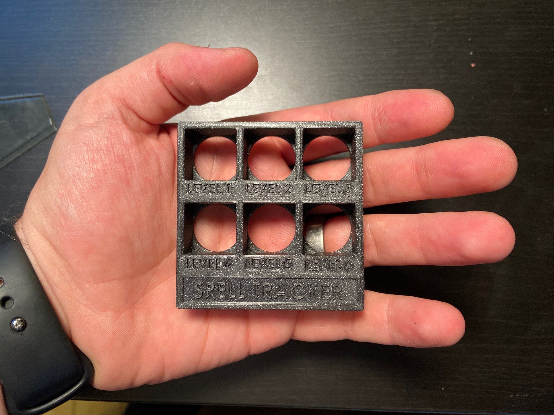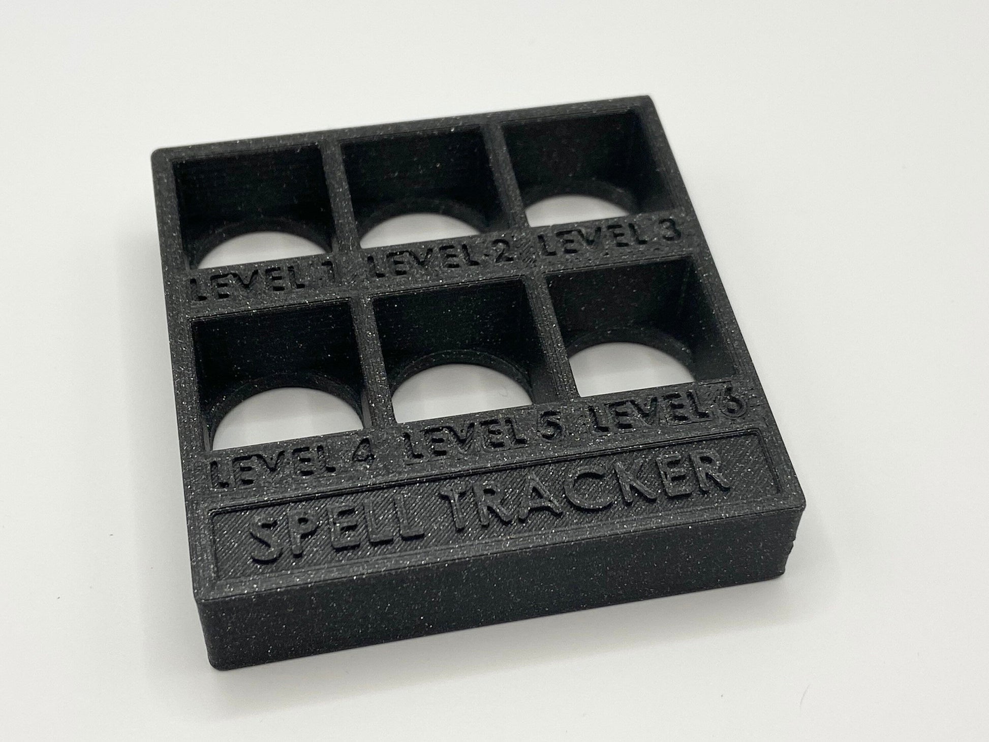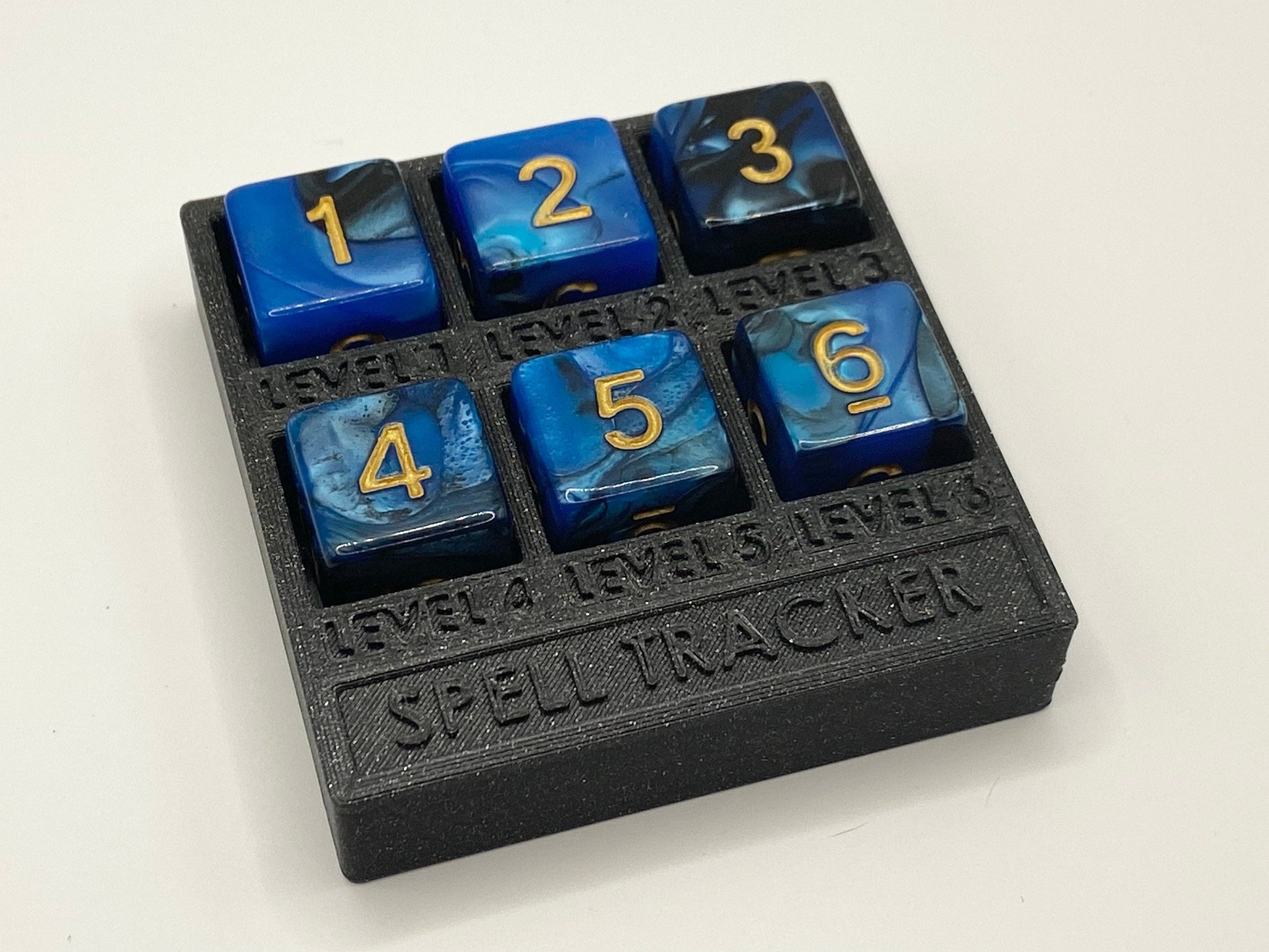 This 3D printed spell tracker is the perfect sidekick for any role playing game. It makes it easy to keep track of everyone's spell slots and reduces confusion while playing. Of course this means a faster and more fun game play experience. Simply place a die in the desired spell slot with the number of spell slots available facing up on the die. Then, when you use a spell or gain spell slots, just change the number on the die and you're good to go. No more searching through tabs on your computer or erasing on a sheet of paper over and over again.