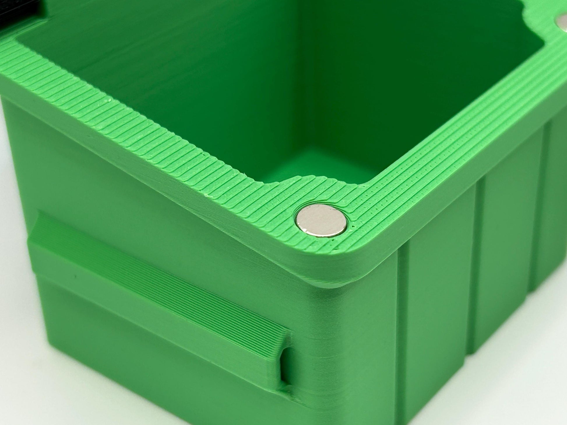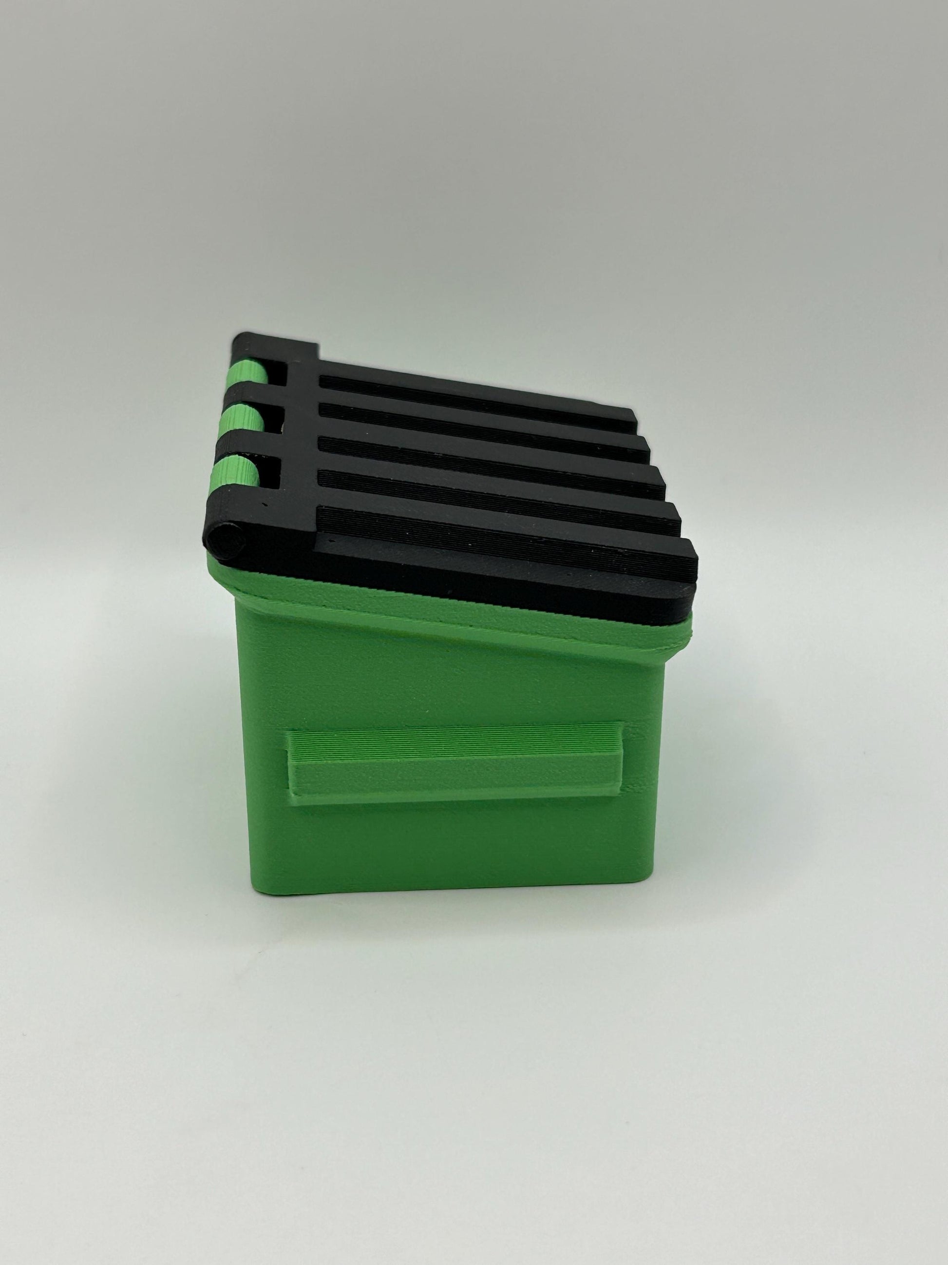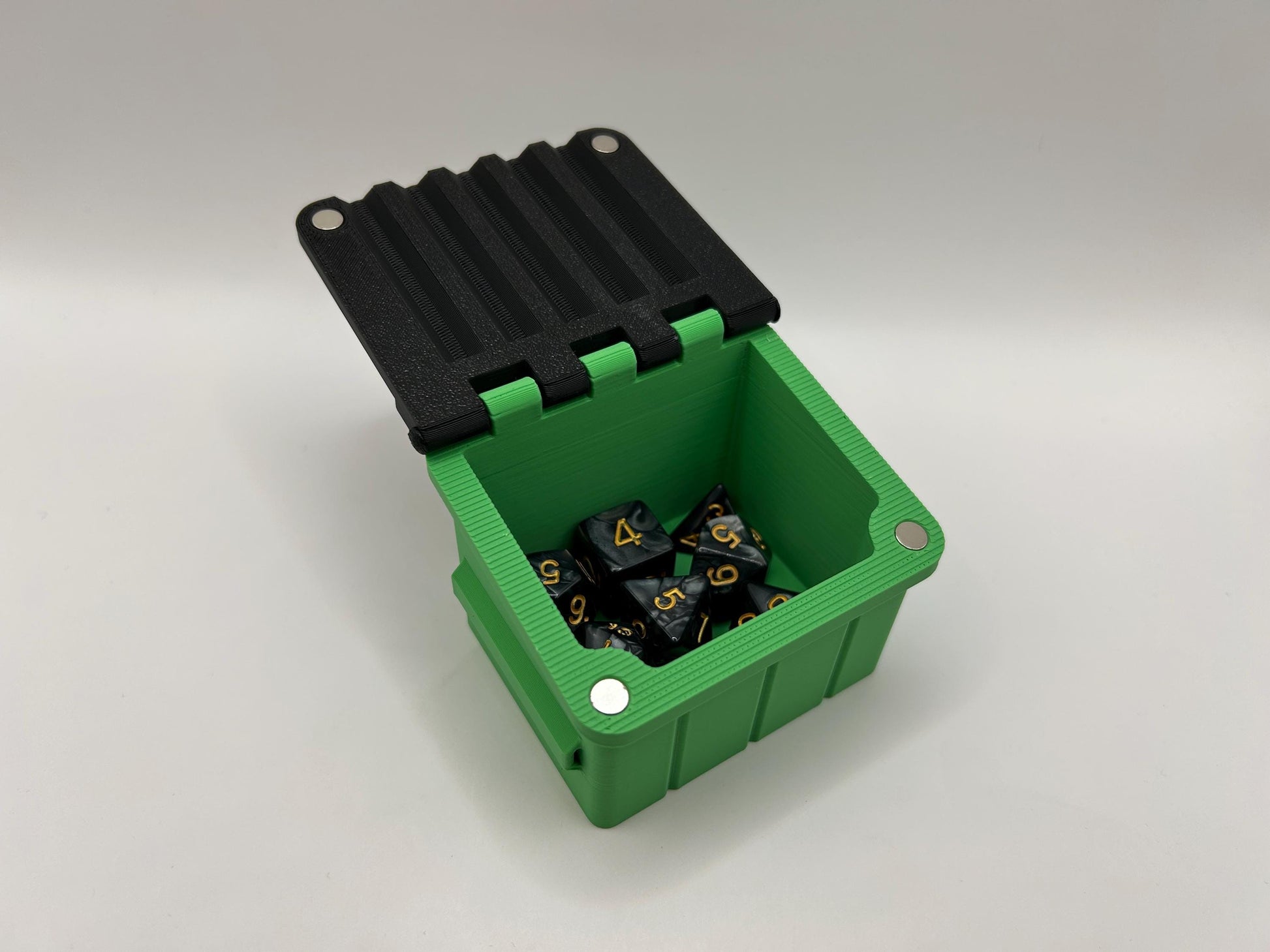 This is the STL file for: This 3D printed dice box is the perfect sidekick for any role playing game. It makes it easy to store, transport, and have your dice at the ready. The lid hinges and is held together with magnets!