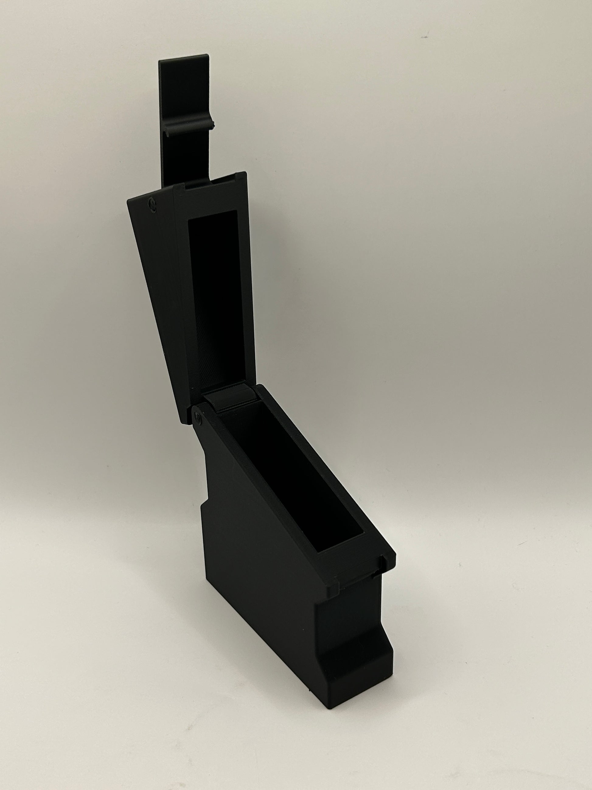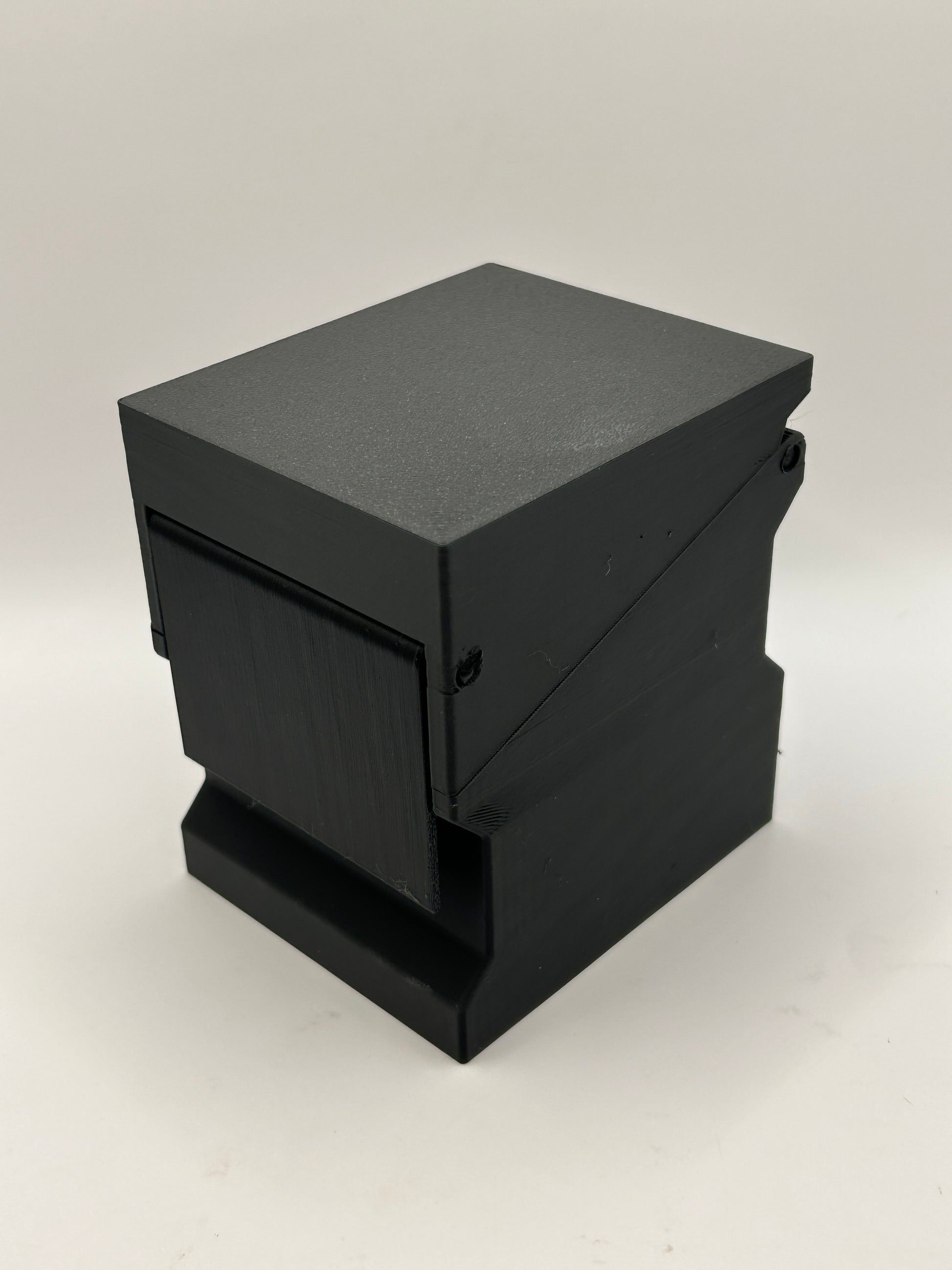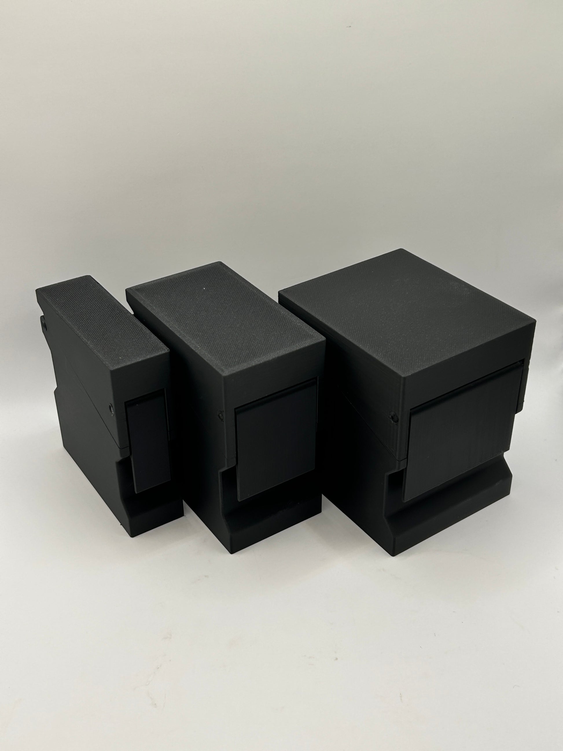This is your straight forward but sleek looking deck box for storing standard sized cards and sleeved cards. It comes in different sizes depending on the number of cards being stored. It serves as a quick and easy way to store cards safely and was designed to not rely on magnets. It uses hinges and a strong latch to keep the contents secure during travel!